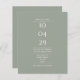 Um moderno design de convite para casamento, com orçamento minimalista, com sua data especial e detalhes de casamento definidos em tipografia clássica e chic em um fundo verde de sábio. Projetado por Thisnotme©