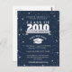 Reunião escolar Salve o design de data, seja para Segundo grau ou pode ser alterado para a faculdade. Elegante, estilo elegante. Fundo azul-noturno com estrelas. Elemento de chapéu de graduação incluído. Personalize o texto. O texto é editável, de modo que pode ser facilmente alterado para um convite ou anúncio para um evento de graduação. Para manter o papel de carta do evento, salve o cartão de data pode ser encomendado no impressão, mas também pode ser comprado em formato digital, transferível. Para economizar mais custos de correio, o design é moderno no sentido de que direciona os convidados para um site onde você pode incluir todas as informações necessárias que um convite deve incluir, por exemplo, detalhes de RSVP. Versão compatível com orçamento.