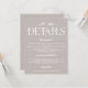 Mantenha sua carta de casamento elegante e simples com este Convite de Detalhes do Casamento Mínimo. Com um layout limpo e moderno com tipografia de eterno, este cartão é perfeito para compartilhar todas as informações importantes sobre o seu grande dia. Sua design minimalista garante que seus detalhes permaneçam o foco enquanto complementam qualquer estilo de casamento. Ideal para casais que apreciam elegância subestimada e estética contemporânea.