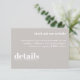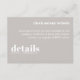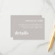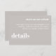 Mantenha sua carta de casamento elegante e simples com este Convite de Detalhes do Casamento Mínimo. Com um layout limpo e moderno com tipografia de eterno, este cartão é perfeito para compartilhar todas as informações importantes sobre o seu grande dia. Sua design minimalista garante que seus detalhes permaneçam o foco enquanto complementam qualquer estilo de casamento. Ideal para casais que apreciam elegância subestimada e estética contemporânea.