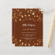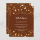 Um fundo castanho decorado com estrelas ouros. Personalize e adicione um nome e detalhes da parte. O nome é escrito com um script de estilo manuscrito, letras brancas coloridas. 1 folha = 1 convite impresso de borda a borda.