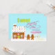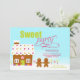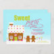Este convite para festas de Natal tem um tema de "gingerbread". O Sweet Party está escrito no topo em verde e rosa. Abaixo, há uma casa de pão de gengibre decorada com muitos doces e gomas. Há um homem e uma mulher de pão de gengibre ao lado da casa. Ao fundo, há montanhas brancas suaves com muita neve caindo no chão. À direita, você pode personalizar facilmente isso com as informações de sua parte. Gráficos do Stockberry Studio em Mygrafico