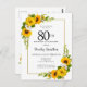 Lindo cartão de aniversário de 80 anos com flores de girassol amarelo. Peônias amarelas e margaridas brancas se misturam com os girassóis. Uma moldura retangular dourada dá um toque elegante. Muito fácil de personalizar. O verso tem um buquê de girassóis. É perfeito para uma celebração de aniversário de verão. Este item faz parte da coleção Yellow Sunflower White Daisy.