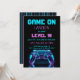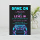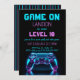 Este convite de aniversário legal de jogos de na moda apresenta um design de controlador de jogos brilhante neon com tipografia e letra de script em preto e roxo sobre fundo preto. Perfeito para comemorar um aniversário de jogadores em estilo, este convite certamente impressionará seus convidados. Perfeito para uma festa de aniversário adolescente ou criança. O convite pode ser personalizado para incluir seu nome, detalhes da festa e quaisquer outras informações especiais que você queira incluir. Prepare-se para hospedar a festa mais legal de videogames com este convite especial.
