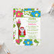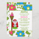 O convite de aniversário desta garota 5x7 tem um design de menina de luau tropical. O fundo está cheio de flores rosa, azuis e brancas. Há uma menina de cabelos vermelha ao lado de uma tocha de tiki. Você pode personalizar facilmente as informações da sua parte no lado direito.