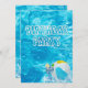 Convidado para festa de aniversário de natação com coquetel e esfera de praia em água turquesa.