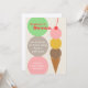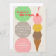 Um convite de aniversário de sorvete com uma ilustração de um cone de sorvete com três colheres (laranja, chocolate e morango) e uma cereja no topo. O lado esquerdo apresenta três círculos (verde marrom e rosa) Personalize com suas próprias informações.