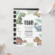 Todo o texto é editável no convite. Perfeito para o tema dos dinossauros. Apresenta folhagem verde, dinossauros, t-rex, triceratops, pterodátilo, Stegossauro e Brontosauro.