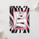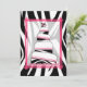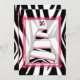 Um convite de na moda de aniversário com um retângulo cor-de-rosa com seção central sobre um fundo de impressão zebra na frente e atrás. A primeira ilustra um bolo de aniversário de impressão rosa e zebra correspondente com quatro níveis fora do centro arredondados. O topo do bolo tem design de "16". Personalize o texto rosa e preto do lado oposto com detalhes da sua ocasião.