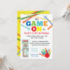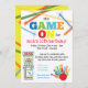 Nosso convite de festa de aniversário Game On Arcade, original e mais vendido, é o convite perfeito para qualquer festa temática de jogos com tema de arcade, laser tag ou boliche. Nosso design apresenta um fundo de quadro negro, uma mistura de letras coloridas e gráficos de jogos de arcade, bola de boliche e pinos e laser.