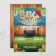Convites rústicos para festa de churrasco no quintal. Apresenta uma churrasqueira preta com fumaça, placa de madeira, ilustração do quintal com cerca de madeira. Muito espaço no verso para adicionar informações extras. Ótimo para qualquer evento de churrasco, como formatura, reunião familiar, aniversário, aposentadoria, etc.