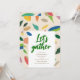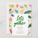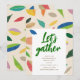 Uma colagem digital cria um fundo colorido de folhas caindo para este convite de festa.