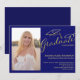 Celebre seu graduado com este convite de festa de formatura com foto elegante em azul e dourado. Com um fundo azul real ousado, tipografia caligráfica dourada moderna e uma ilustração elegante de um chapéu de formatura, este design destaca a foto do seu graduado lindamente. Personalize com o nome do graduado, escola, ano de formatura e detalhes da festa. Perfeito para celebrações de formatura do ensino médio ou faculdade, este design clássico e moderno funciona maravilhosamente para cores de escola como azul-marinho e dourado. Um anúncio atemporal para familiares e amigos celebrarem este marco especial.