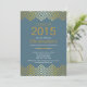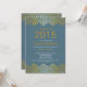 Convite formal de festa de formatura com uma moderna divisa dourada, de cima e de baixo, sobre um fundo azul empoeirado. Sacudir o nosso convite para o na moda para encontrar uma resposta para um toque especial extra. Também pode ser usado para um anúncio de graduação. Fácil de personalizar com a sua classe de informações de formando 2015. Disponível em nosso compro em uma variedade de cores populares do segundo grau e da faculdade.