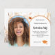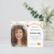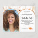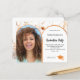 Adicione sua própria foto vertical do formando. Um quadro fotográfico colorido cor de pêssego escuro. Uma cor branca de fundo. Decorado com flores silvestres em pêssego e bege. Personalize e adicione um nome e detalhes da parte. 1 folha = 1 convite impresso de borda a borda.