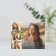 Anúncio de graduação e convite de festas elegante e amigável, com a foto do formando sobreposta com uma faixa de três fotos quadradas menores, "formando" em uma escritura branca moderna e seu nome e ano de aula em uma tipografia branca simples. Adicione os detalhes da parte no verso.