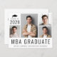 Anúncio de graduação e convite de festas do MBA moderno, orçamental, com mestrados de graduação em 4 fotos, "Formando MBA" escrito em letras grandes e seu ano de aula, nome e escola ou universidade em tipografia simples. No verso, adicione os detalhes da parte.