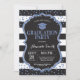 Cartão de Convite à festa de formatura Preto e Azul para a Brilhante. Confetti Azul com Glitter. Black and White Stripes. Digital Imprimível. Para mais personalização, clique no botão "Personalizar" e use nossa ferramenta de design para modificar este modelo.