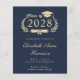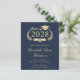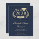 Convite moderno e econômico para festa de formatura na faculdade com azul-marinho escuro, apresentando "Turma de" em uma ilustração dourada de uma coroa de louros que incorpora um enfeite de gorro de formatura e diploma e o nome do formando em uma elegante escrita dourada clara. Adicione a escola, curso, honrarias ou planos futuros e os detalhes da festa de formatura em tipografia dourada simples.