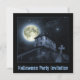 Convite com foto original de cena noturna com lua de cheio e casa assombrada.