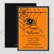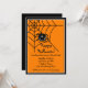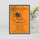 Comece sua festa de Halloween com nosso Convite de festas de excelente Feliz Halloween apresentando uma aranha bonita em uma teia sobre um fundo laranja com uma borda preta. Personalize com suas informações pessoais e você está pronto para ir. ©Lynnie Smith