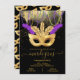 Convites modernos de festa de máscaras do Carnaval em dourado e roxo. Caracteriza uma máscara dourada com penas, contas penduradas e fundo de confetes dourados. Ouro falso.