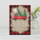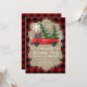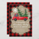 Convite para o Feriado de Natal de Caminhão Vermelho com fundo de xadrez de búfalo vermelho.