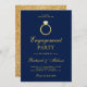 Incêndio aos seus convidados com este elegante convite de festa de noivado com um belo anel de diamante de ouro contra um fundo azul. Basta adicionar os detalhes do seu evento neste modelo fácil de usar para torná-lo um convite de tipo único. Sacudir a placa para revelar uma bela textura falsa de brilho dourado na parte traseira da placa. Este convite é totalmente personalizável. Todos os textos são editáveis e a cor de fundo pode ser facilmente alterada para quais melhores ajustados você pode fazer.
