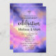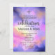 Um convite de noivado elegante com uma boa combinação de pastéis e cores brilhantes. Uma ilustração colorida de abstrato com uma imagem de espaço cósmico em aquarelas cor-de-rosa, roxa e amarela. As cores se misturam e se misturam criando formas etéreas luminosas com pequenas estrelas cintilantes espalhadas por toda parte.