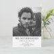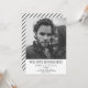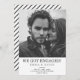 Este convite para festas de noivado moderno apresenta uma tipografia atraente e uma fotografia de casal favorita. Sacudir a placa por cima para revelar um design de faixa diagonal preto e branco na parte traseira da placa.