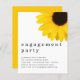 Convite para Festa de noivado de girassol amarelo de orçamento. Um alternativo MENOR de 4,5" x 5,6", compatível com o orçamento. Disponível em um STOCK de PLACA SEMI GLOSS 110 lb ou um STOCK de PAPEL THINNER SATIN FINISH 80 lb. Os envelopes são um extra opcional. Estilo informal. Um girassol gigante fica no topo à direita e o cabeçalho é grande abaixo em na moda com minúsculas, com os detalhes no fundo. Personalize facilmente o texto para seus próprios detalhes.