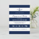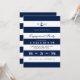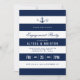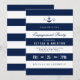 Um convite à Festa de noivado náutica ousado, mas moderno, que inclui um ponto para os monogramas noiva e noiva e informações relevantes sobre o seu evento dentro de faixas horizontais.