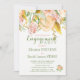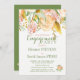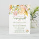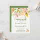 Rosas elegantes de marfim, pêssego, pincel e peônia de ouro buquê com convite de festa de noivado verde-férn com um texto moderno e moderno e comovível de tipografia. Ideal para uma festa de inverno ou de primavera floral.