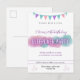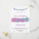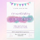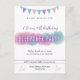 Convite de aniversário elegante e divertido para uma festa de sono de uma menina ou adolescente. Um efeito de brilho moderno e cores pastéis bonitas em rosa, roxo e azul/teal são usadas na letra, e o design é finalizado com uma estrela roxa. Personalizável para personalizar com todos os detalhes da sua festa.