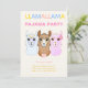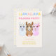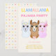 Cartão de convite para festa de pijamas do llama. Três lhamas fofos em fundo bege claro. Padrão de estrelas multicoloridas no verso. O texto está pronto para ser personalizado.