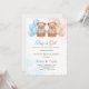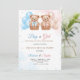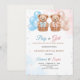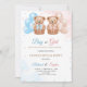 Convite para uma festa de revelação de gênero apresenta dois ursinhos em cestas de vime, um com balões azuis, o outro com rosa. O texto diz "Menino ou Menina".