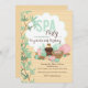 Uma imagem serena, em cores suaves, apresentando ramos de bambu e itens de spa, como toalhas, pedra vulcânica, velas perfumadas, cremes, perfumes, etc. Com certeza irá atrair os seus convidados no momento em que abrirem o envelope do convite.