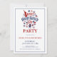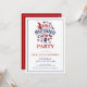 Convite para festa com Símbolos do Dia da Independência com texto personalizado em vermelho e azul em um fundo branco. Comida, diversão e fogos de artifício.