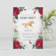 Convide os convidados para uma sofisticada celebração de primavera com este belo convite de festa watercolor Kentucky Derby. Com uma moldura delicada de rosas vermelhas e borboletas esvoaçantes em torno de uma silhueta de cavalo dourado, este design captura a elegância de uma festa de jardim. O fundo pastel suave e os detalhes florais tornam-no perfeito para uma interpretação feminina do Run for the Roses.