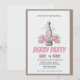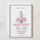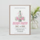 Adicione um toque de sofisticação à sua celebração do Kentucky Derby com este lindo convite em estilo vintage. Com uma garrafa de champanhe clássica amarrada com uma fita rosa e cercada por uma exuberante guirlanda de rosas cor-de-rosa, este design captura perfeitamente a tradição "Run for the Roses" com um toque feminino e elegante.