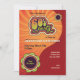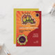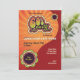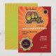 Convite para festa dos anos 60 com uma tipografia estilosa 'Festa dos anos 60'. Este design inclui elementos de vermelho, laranja, amarelo, verde brilhante e roxo escuro, explosão de estrelas em espiral e designs inspirados nos anos 60. Inclui um modelo para personalização.