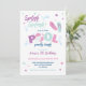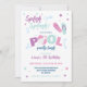 Um convite divertido para uma festa na piscina com esquema de cores rosa e roxo e um design listrado na parte de trás. Perfeito para a celebração de aniversário de uma menina no verão!