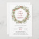 Este elegante convite para festas de "comer, beber e ser feliz" apresenta uma bela cor d'água pintada à mão, pinheiro de inverno, eucalipto e morangos vermelhos dispostos em uma coroa na moda com um elegante roteiro escrito à mão. Localize itens correspondentes na Coleção de Berries Botânicos do Winter Boho.