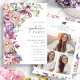 Convite à Festa de formatura Floral Moderno. Anuncie o grande dia do seu formando com um convite maravilhosamente desenhado, com um buquê de lado gracioso de florais pintados à mão, aliados a caligrafia refinada para um toque sofisticado. Matizes roxos, magenta, arrojados, cor-de-rosa pincelado, azuis empoeirado e verde de sábio pela frente, enquanto o verso oferece espaço para três fotos favoritas. Personalize cada detalhe — de redação a fontes e fundos — fazer-o como um verdadeiro reflexo de sua personalidade. Crie uma impressionante primeira impressão e comemore este marco com elegância!