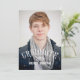 Cartão de Convite para Festa de formatura de Fotografia para formandos machos com um design de camada simples. Elke Clarke ©. Personalize com suas informações de formando selecionando "personalizar" ou usando os prompts do menu modelo. Troque a foto da sua própria amostra. design flexível para permitir a escolha de vários tamanhos diferentes de placas, dependendo da foto de seu formando. Elke Clarke © Diferentes combinações de cores escolares podem ser personalizadas. Mostrado em preto e branco atrás.