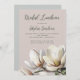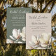Modelo de chá de panela com flores brancas de magnólia. Para a noiva do sul, grandes flores brancas decoram o fundo do papel bege rosado. O texto é verde-escuro com título de partido e nome da noiva no roteiro moderno. Mude o título para um lanche, chá de casamento ou chá de noiva. Mostrado em papel com borda recortada, que você pode mudar facilmente.