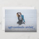 Este cheio sangrou o anúncio da graduação em fotos e o convite contém as palavras "aventuras aguardam" em azul. Ele tem espaço para os detalhes do seu formando na frente, com mais espaço para texto na parte traseira da placa.