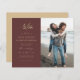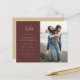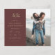 Esta design de casamento minimalista é perfeita para aquele casal moderno que procura por algo único. Este convite apresenta uma ramificação de aquarela em tons de sépia/ouro com uma magnífica tipografia moderna por baixo e sua própria foto personalizada no lado direito contra um belo fundo vermelho de merlot. No verso, há um fundo dourado que complementa perfeitamente a frente. Clique no botão azul "personalizar" para adicionar seus próprios detalhes e ver seu design vivendo na sua frente!