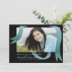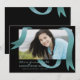Um convite moderno com uma fita azul escura sobre sua foto favorita com um fundo preto.