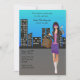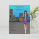 Um convite moderno que mostra uma paisagem urbana como fundo e uma linda jovem atravessando uma rua e segurando uma bolsa. Este é um convite maravilhoso para uma festa de aniversário de adolescente, despedida de solteira ou um convite para fazer compras.